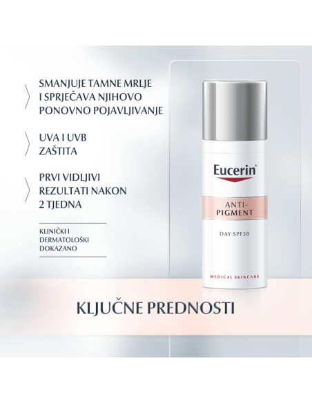 Eucerin Anti-Pigment dnevna njega SPF 30 s UVA i UVB filtrima, hidratantna njega pruža učinkovitu zaštitu od sunca i smanjuje mogućnost stvaranja hiperpigmentacijskih stanja uzrokovanih suncem. Koža izgleda ujednačenije i blistavije.