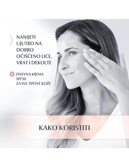 Hidratantna dnevna krema protiv hiperpigmentacije sa SPF 30, UVA i UVB zaštitom za ujednačeniju i sjajniju kožu.