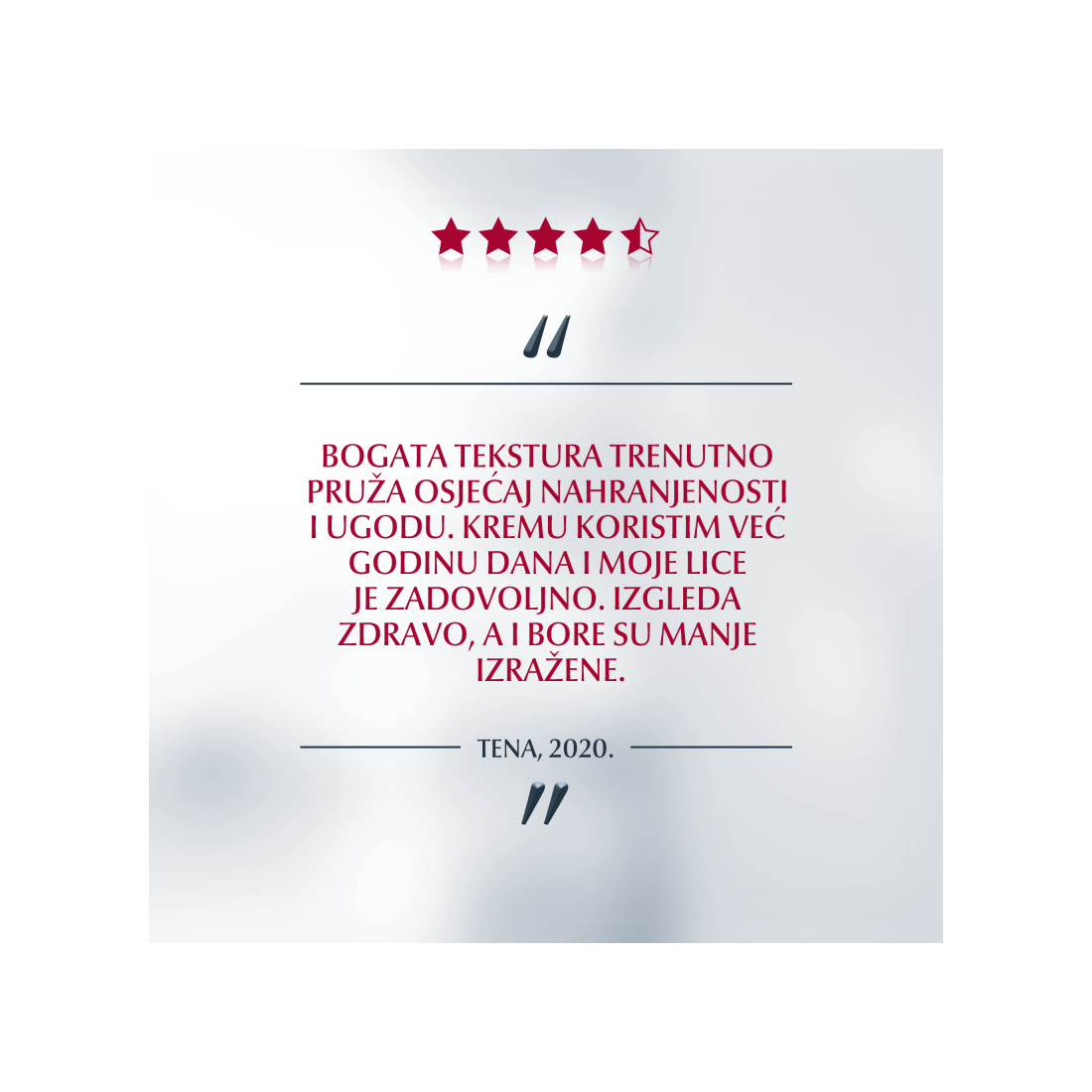 Ispunjava duboke bore i poboljšava elastičnost. Koža izgleda čvrsto, svježe i sjajno.