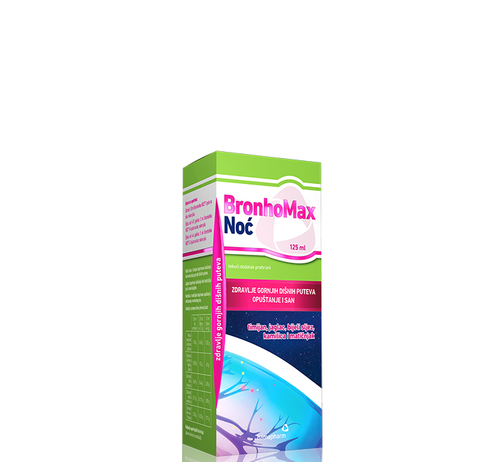 BronhoMax NOĆ® je proizvod koji sadrži 5 djelatnih komponenti: timijan, jaglac i bijeli sljez za zdravlje gornjih dišnih puteva te kamilicu i matičnjak za opuštanje i održavanje normalnog sna.